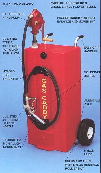over land and then along a dock to your boat. The Gas Caddy fuel container is easily moved on